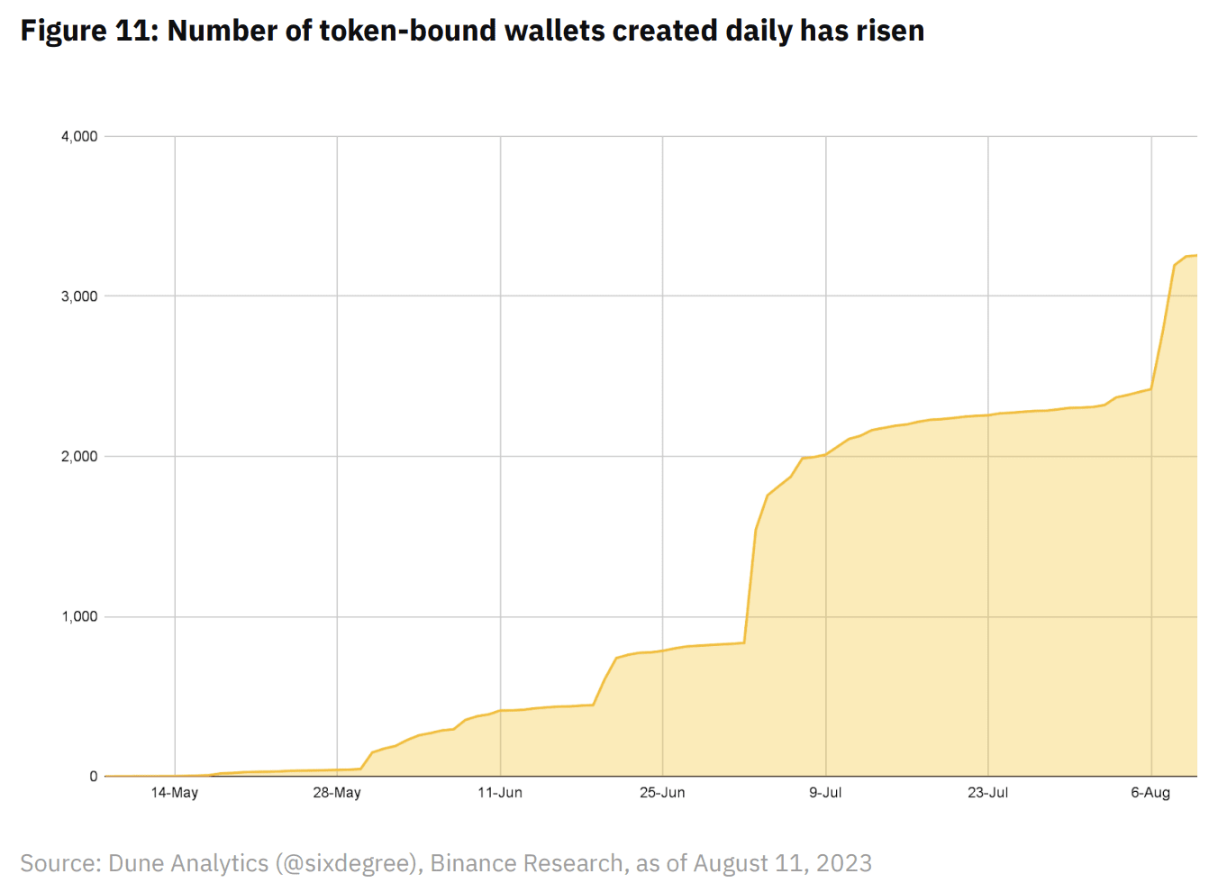 8) ERC-6551 was a recent innovation in May 2023 that turbo-charged NFTs to become their own wallet (Token Bound Account) to custody other NFTs. The adoption rate has significantly risen as it seeks to improve the gaming and on-chain identity management sectors.