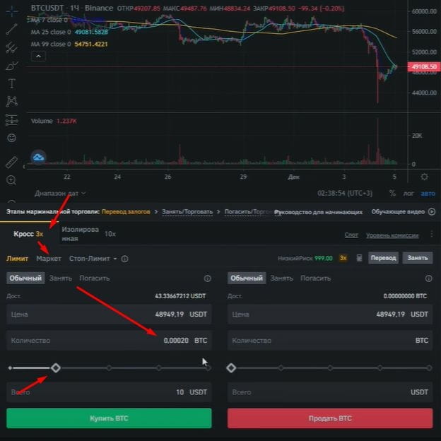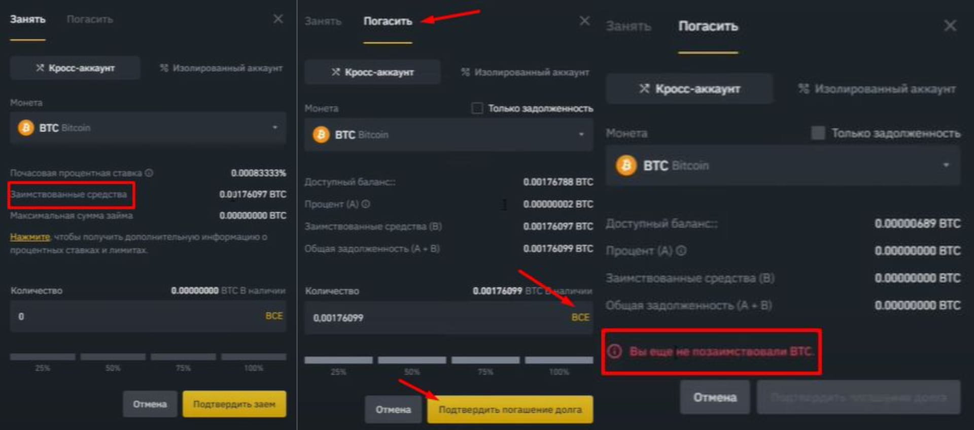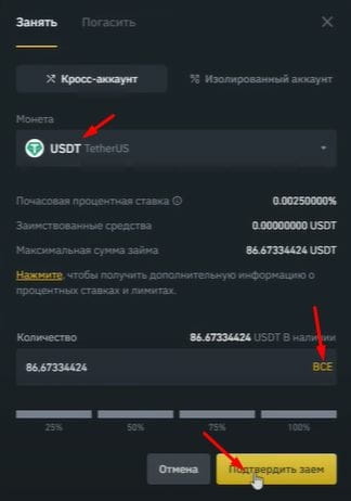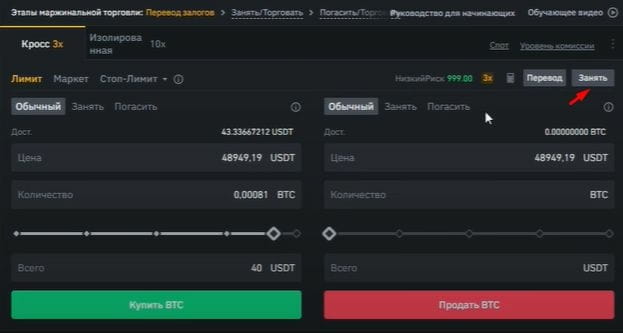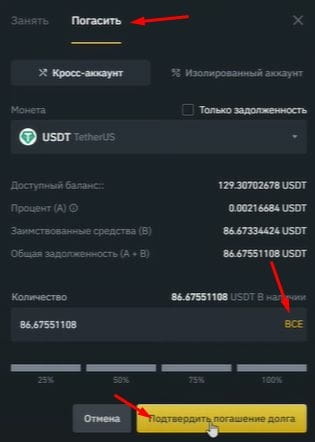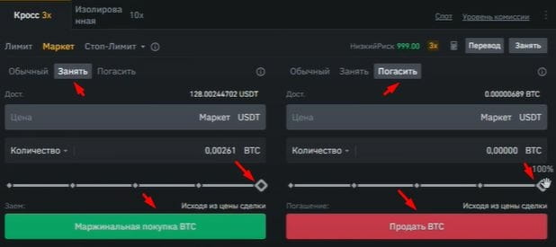 You can borrow and repay directly from the trading window for more convenience. The main thing is not to get confused. To do this, use the “Borrow” and “Repay” buttons. When choosing the number of borrowed coins, our funds will be used along with the exchange money.