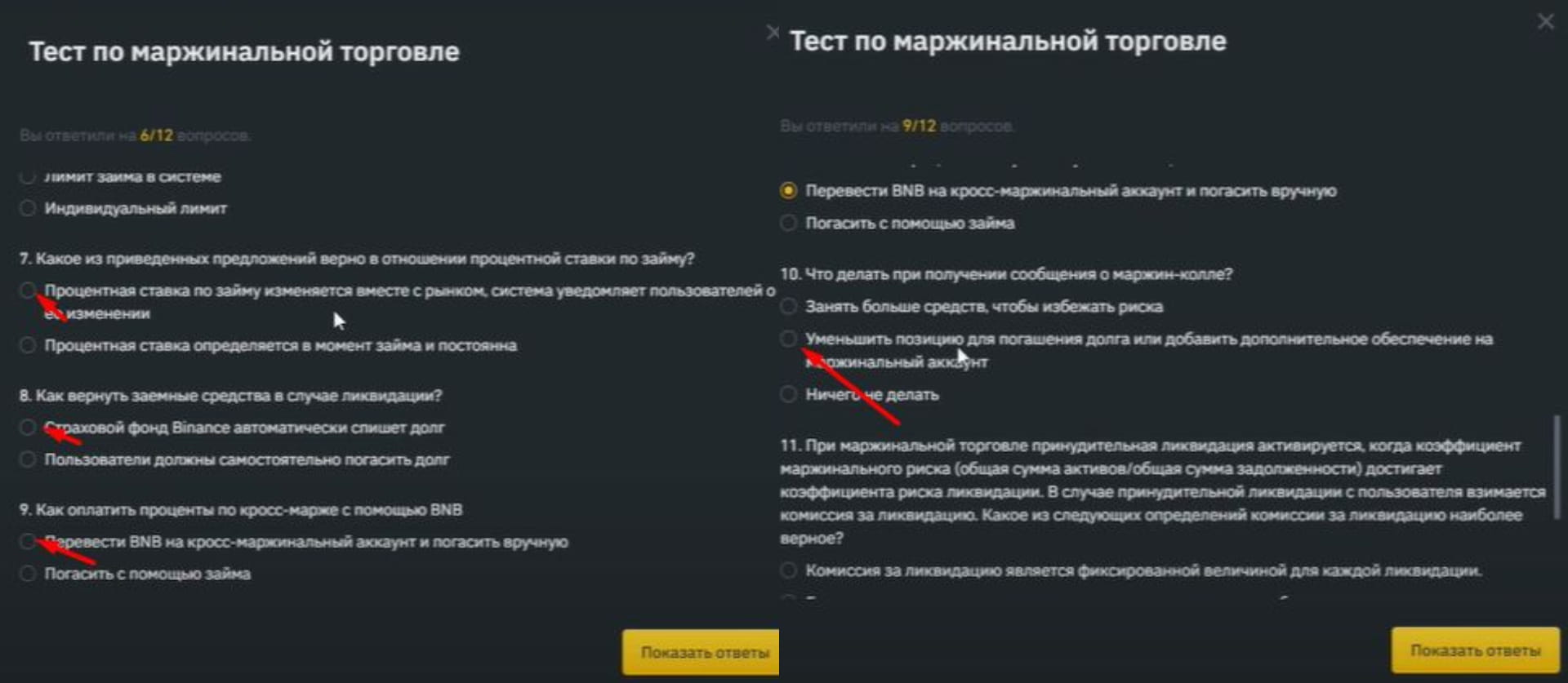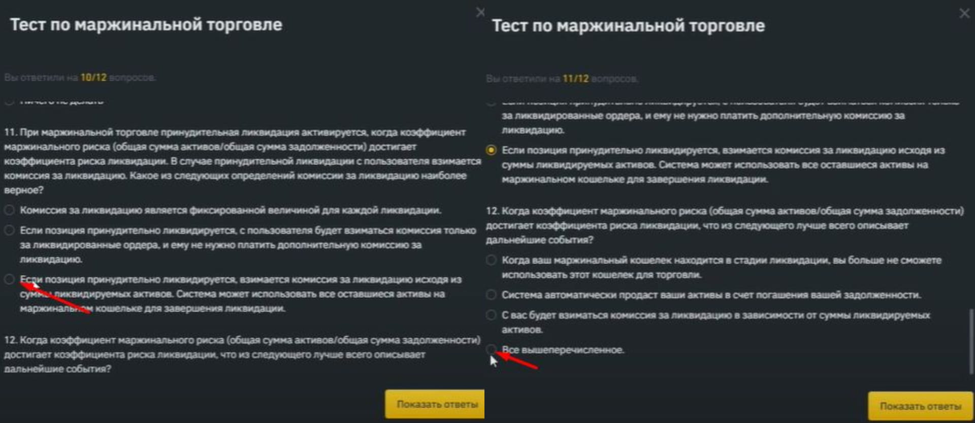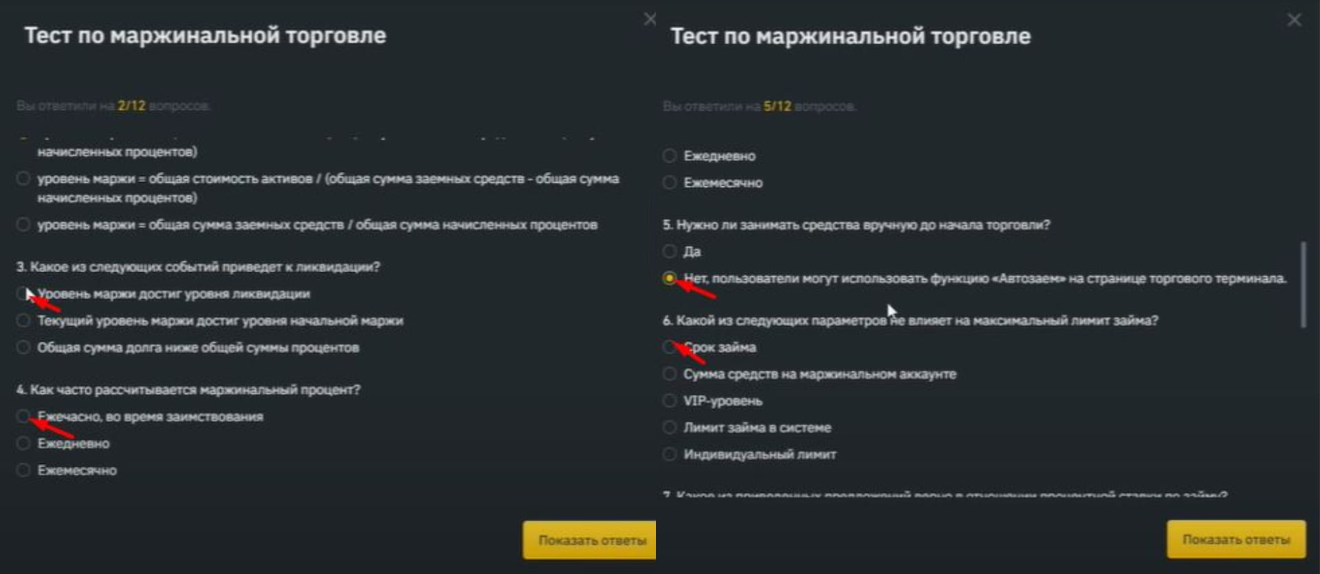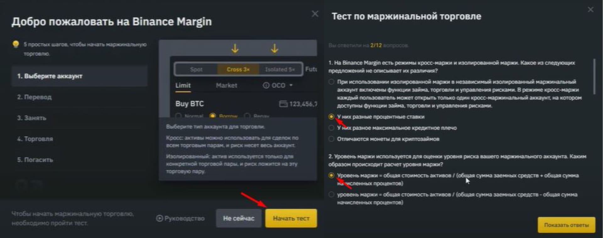 First you need to pass the test. Click the “Take Test” button. There are only 12 questions. I'll show you how to answer them. We agree to the terms of margin service and proceed to the test. I indicated the correct answers with arrows.