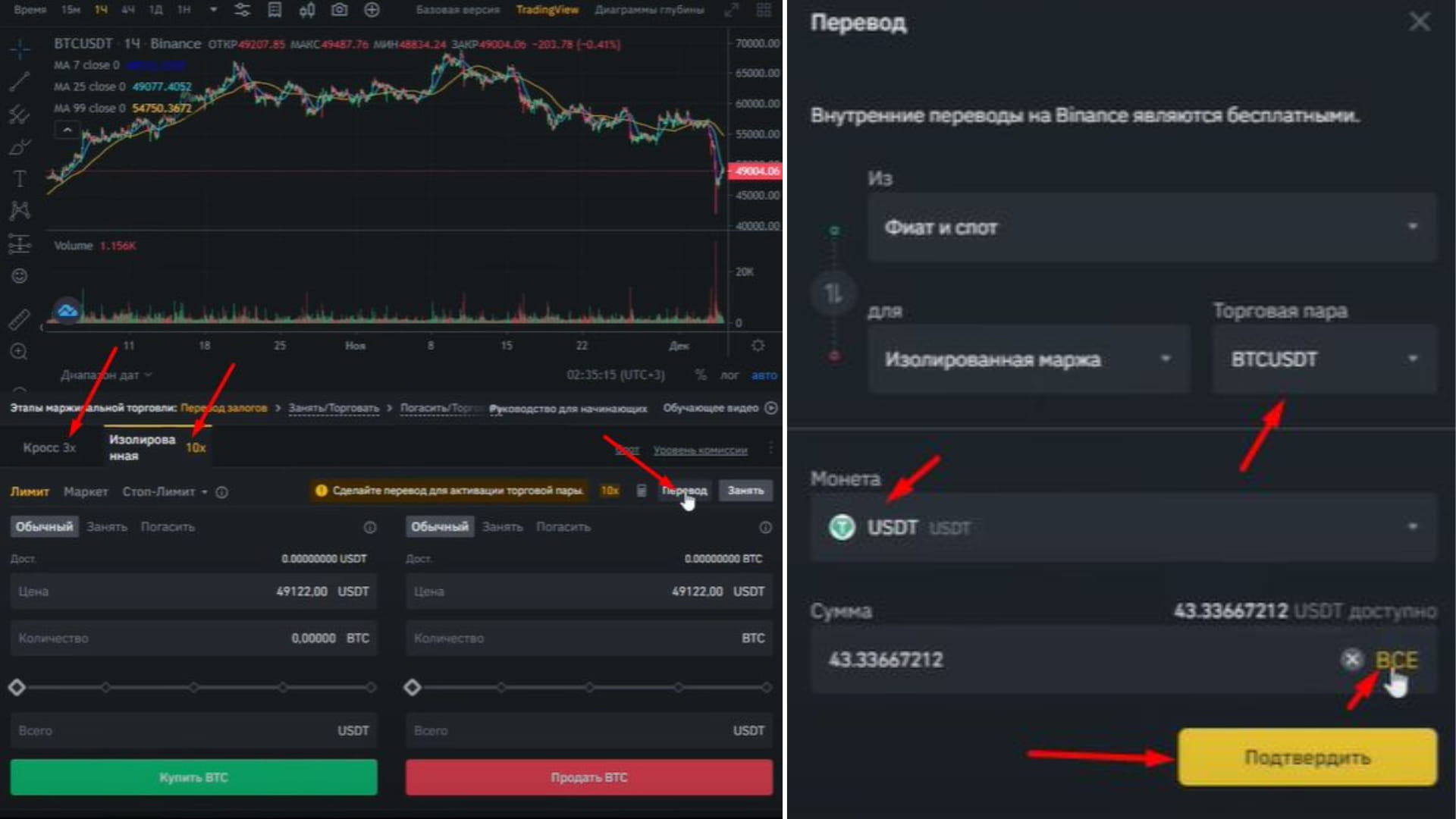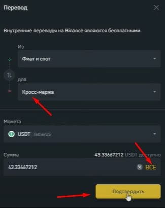To activate a trading pair, we need to transfer money via internal transfer from the “Fiat and Spot” section to the isolated margin. You can choose a trading pair, or you can simply transfer to cross margin and then choose what exactly you want to buy. Let's do so.