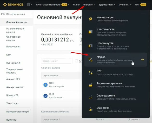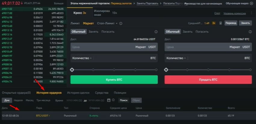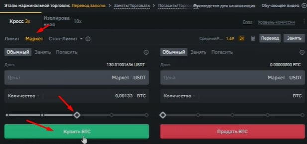 Go to the “Trade” tab and select the “Margin” section. Here we can trade up and down, borrow money from the exchange, etc.