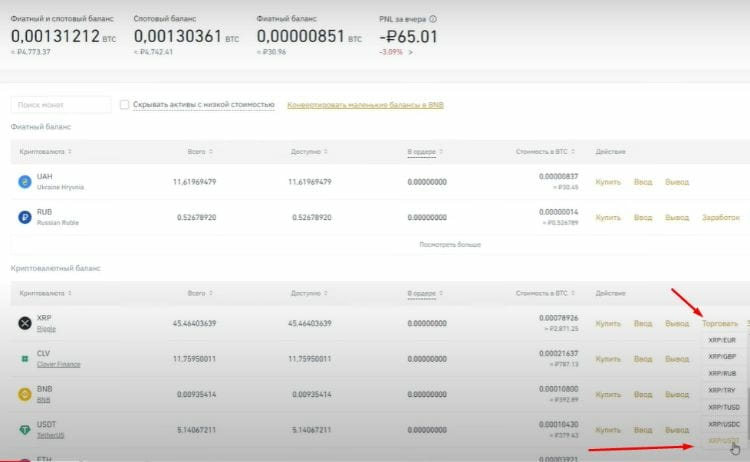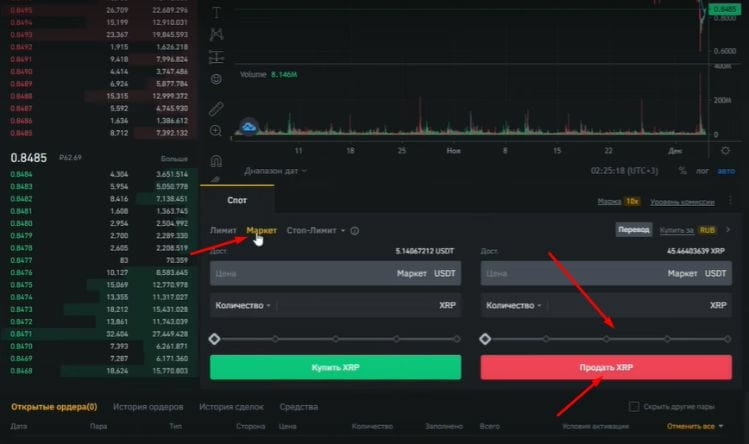 Let's convert everything to USDT for convenience. I will tell you how to do this using the example of the XRP token. Click “Trade”, find the XRP\USDT pair and we are transferred to the trading screen. We select “Market” to buy at the market price, that is, the purchase will take place at the current price.