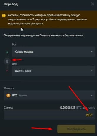 After receiving profit from margin trading, you can transfer it to your spot wallet by clicking the “Transfer” button. We select from “Cross Margin” to “Fiat and Spot” the coin that we will transfer, the amount and click “Confirm”. The received funds are located in the “Wallet” ⇒ “Fiat and Spot” section on the Binance home page.