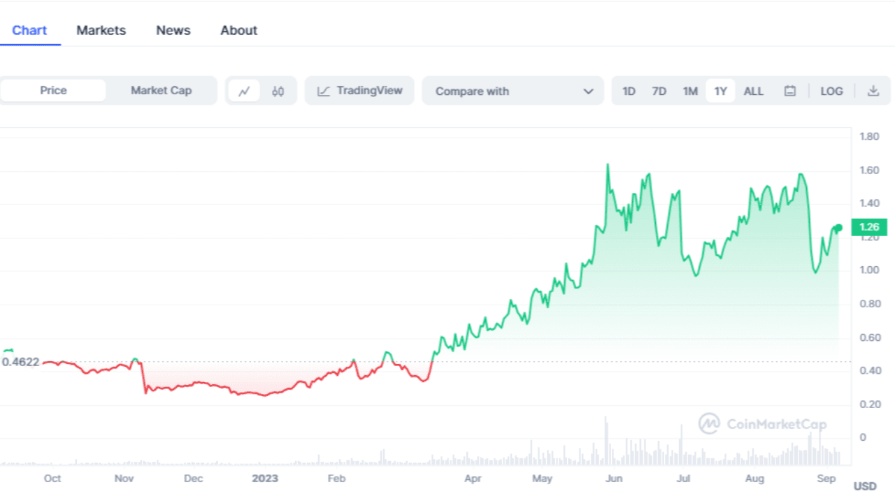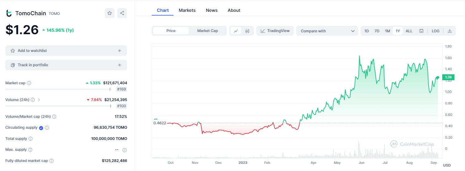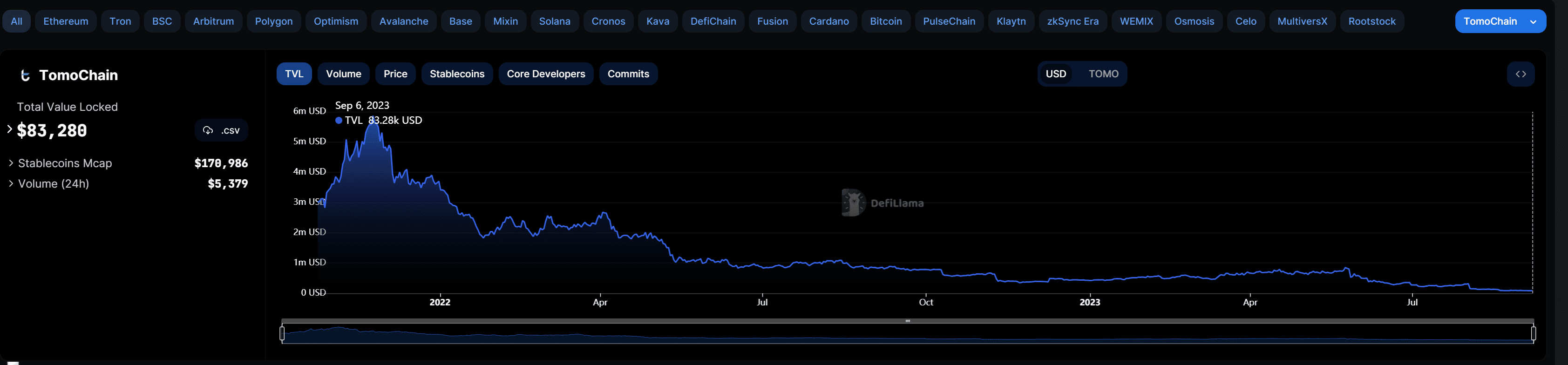 The first issuance time was 2018-03-09, the crowdfunding price was $0.2500, the maximum supply was 100,000,000 TOMO, the circulation volume was 96,830,754 TOMO, and the circulation was 96.4%. The current price is around $1.3, and the peak price was $3.9 (in 21 years). The current market trend has also increased a lot. Then in terms of distribution, their team did not get a lot of it, only 12%, but the TVL on the chain is relatively poor, only $80,000, which can be said to be miserable, that is, basically no one is building applications on it.