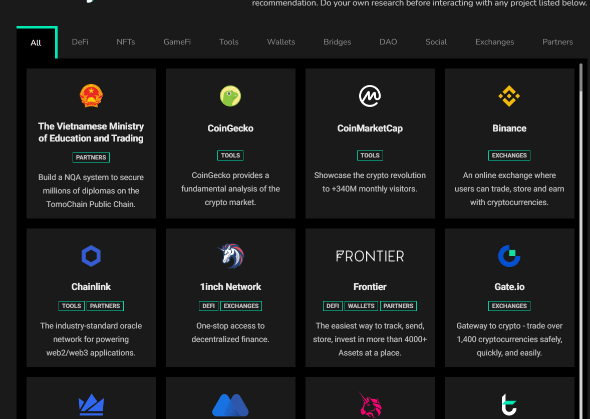 After looking at the applications on the chain on the official website, it currently covers a wide range of fields, including defi, nft, gamefi, tools, bridges, social networking, etc., with a total of about 150+. However, there are some doubts, such as many of these exchanges or CMCs should have nothing to do with it, and they are suspected of trying to ride on the popularity, but in fact, there are no substantive and valuable applications.