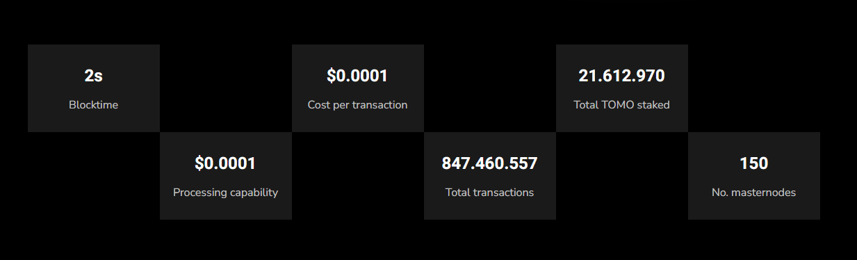 TomoChain is a public blockchain based on Proof-of-Stake Voting consensus. TomoChain launched its mainnet in December 2018 and is currently maintained by 150 masternodes. TomoChain is compatible with the Ethereum Virtual Machine (EVM), can process 2,000 transactions per second, with a block interval of only 2 seconds and almost zero gas fees. Security, stability and integrity are guaranteed by new technologies such as double verification, smart contracts and "true" randomization. TomoChain supports all EVM-compatible smart contracts, protocols and cross-token transactions.