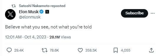 But Musk then posted a suggestive tweet, which was forwarded by a Satoshi Nakamoto-certified account, adding a sense of mystery to the entire incident. He wrote: "Believe what you see, not what others tell you." The tweet received 28 million views and nearly 78,700 retweets and shares.