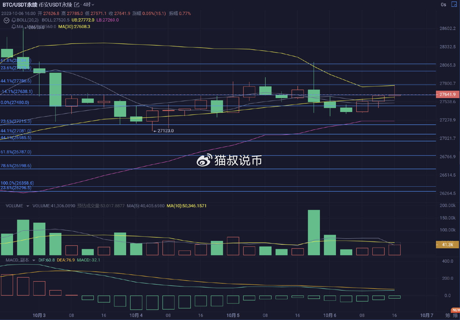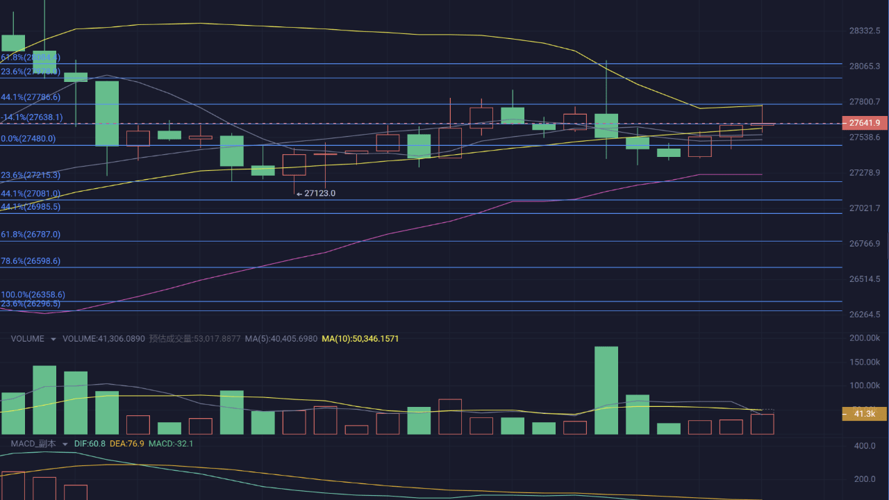 As of the time of writing, Bitcoin is priced at around 27,700. The market started to fall during the European and American trading hours last night, then fluctuated sideways. It fluctuated and rose significantly during the Asian trading hours. Although the trading volume is not large, the market is rising steadily. It can be seen that the pressure range of 27,500 to 28,000 has been significantly weakened.