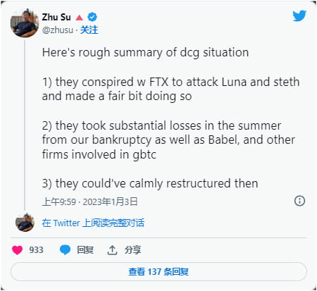 Three Arrows Capital co-founder Su Zhu tweeted that DCG and FTX conspired to attack LUNA and stETH, and accused them of misleading them.