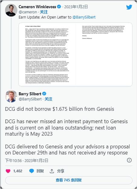 Gemini co-founder Cameron Winklevoss also sent a critical open letter to DCG founder Barry Silbert.