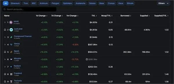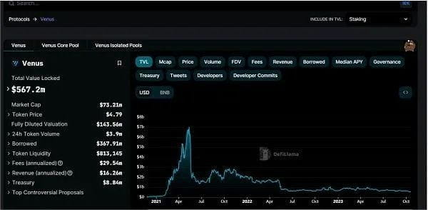 Despite the bear market, the performance of the Venus protocol is still impressive. According to DeFiLlama, the top five lending protocols are AAVE, JustLend, Compound, Venus, and Spark. As the top-ranked lending protocol on BNB Chain, Venus also occupies a leading position in the lending field of the entire chain. Even in the bear market, the total locked value (TVL) of Venus remains at US$5.67 billion, a huge amount of funds that exceeds the overall TVL on many public chains. This further proves the solid position and strong appeal of the Venus protocol.