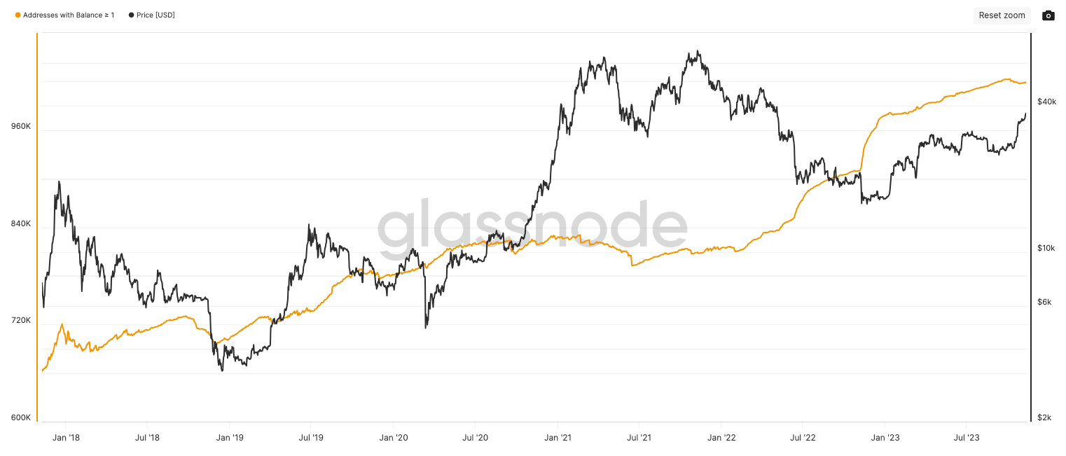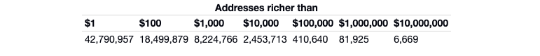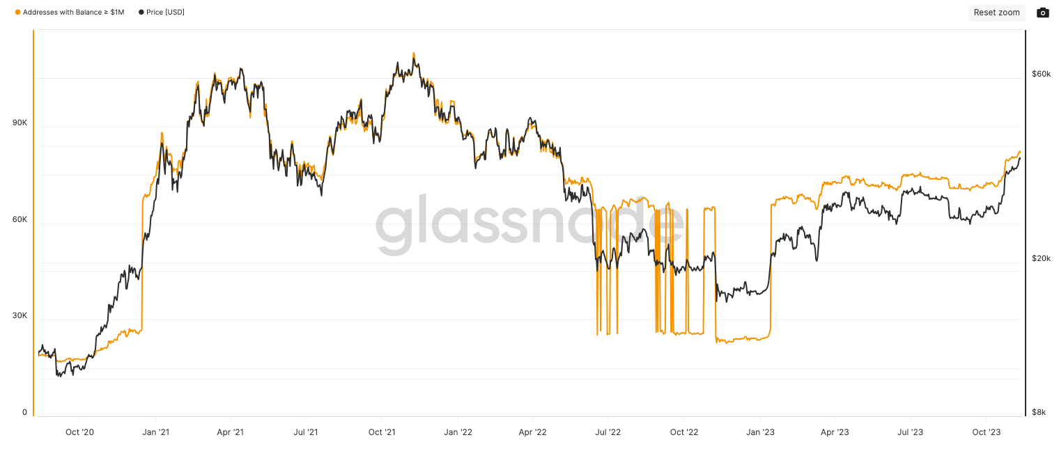 The number of crypto wallet addresses holding more than $1 million in Bitcoin