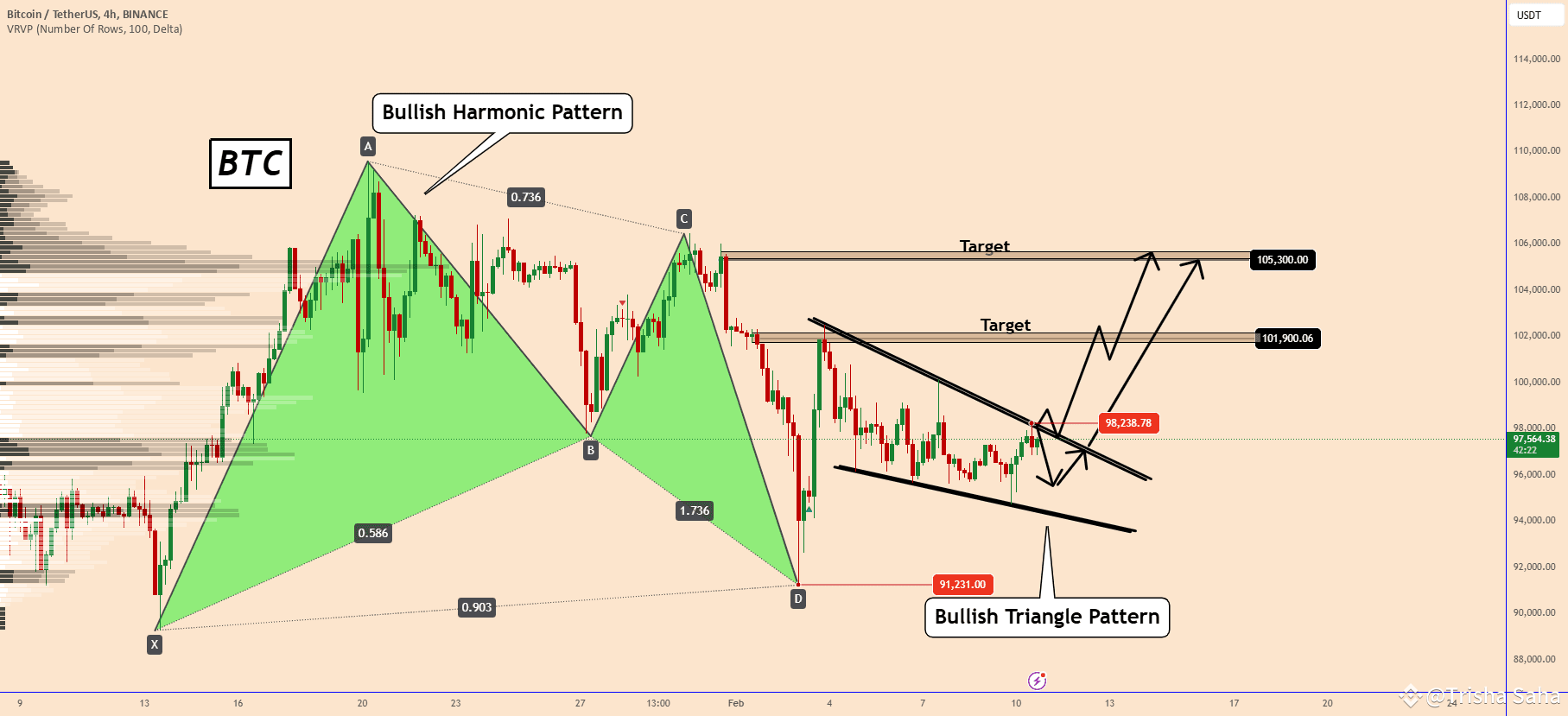 However, a solid breakout above the triangle pattern could propel BTC further to target levels of 101,900 and 105,300.