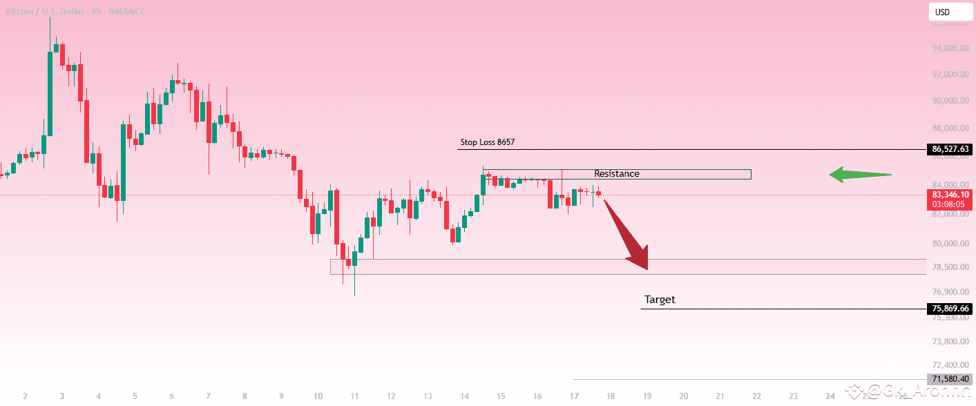 This is a 4-hour chart of Bitcoin (BTC/USD) showing a key resistance level around $86,527 and a potential bearish move towards lower support zones.