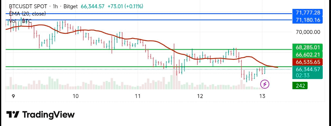 Support remains layered, with $66,000 acting as the first defensive zone. A breakdown below $65,000 — which aligns with the 61.8% Fibonacci retracement — could open the door to deeper downside exploration toward $63,500 and potentially $62,000. The broader structural support sits near $61,200, a level likely to attract stronger demand if tested.