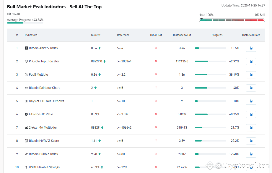 The absence of signals suggests the market has not entered the type of extreme euphoria, with an average progress level of 43.84% toward peak conditions, far below danger territory.