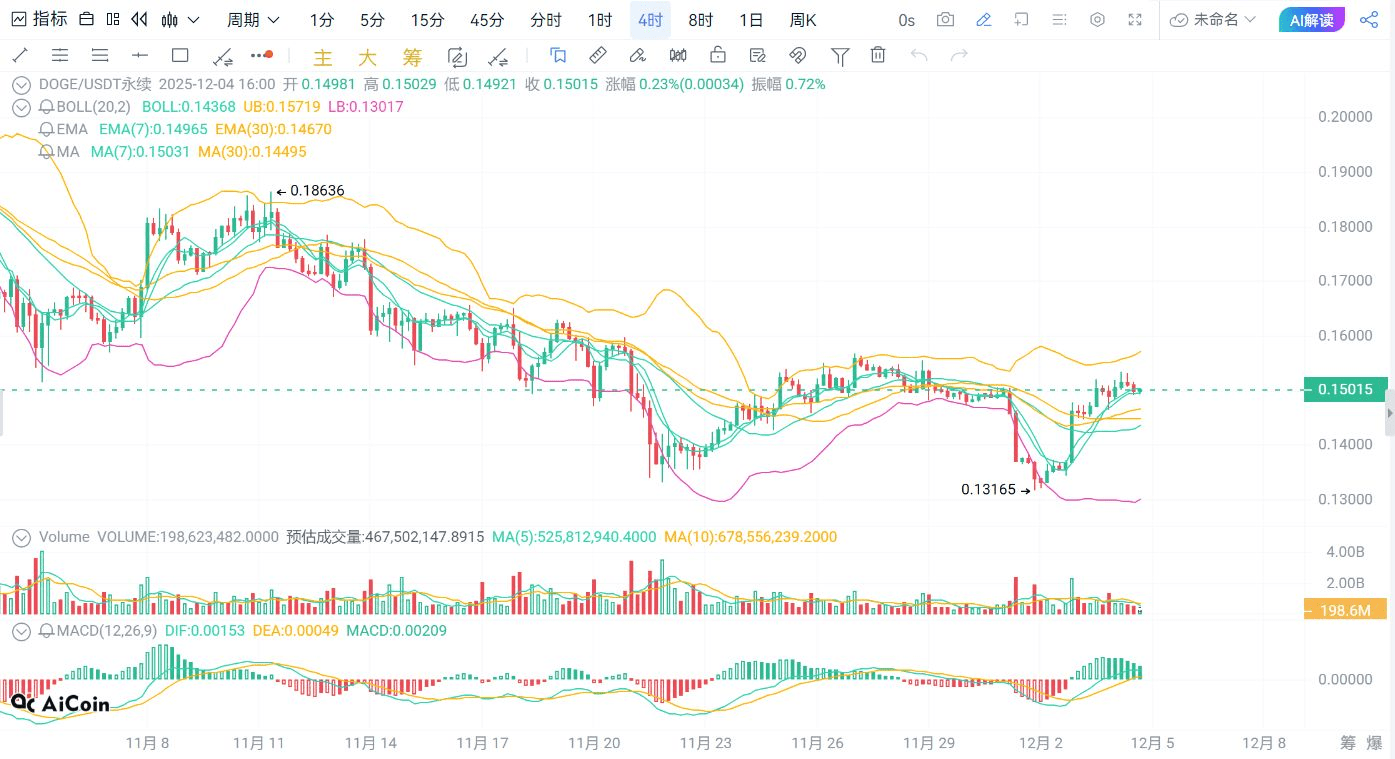Looking at the four-hour K-line chart of DOGE, my intuition tells me that this is not just a simple sideways movement; there must be significant actions coming up. Below, I will share my analysis to explain the situation behind this.