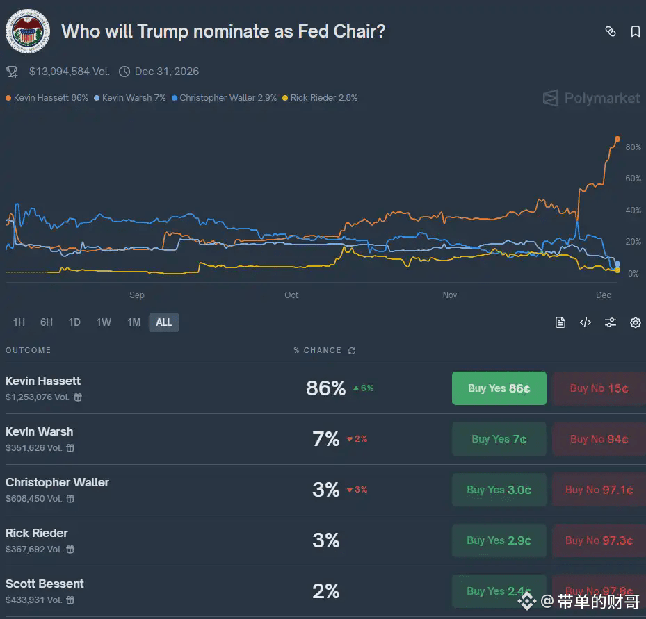 在预测市场 Polymarket 上,哈塞特当选新一任美联储主席的概率已经上升至了 86%,远远领先其他可能的美联储新任主席人选。