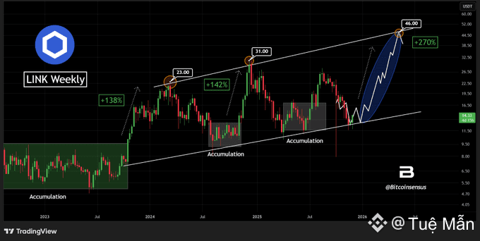 Theo phân tích kỹ thuật, cạnh trên của kênh tăng trưởng dài hạn nằm ở khoảng 46 USD, trùng khớp với mục tiêu tăng giá tiếp theo. Dù đây là một bước nhảy lớn, nhưng hoàn toàn phù hợp với diễn biến của LINK trong các chu kỳ trước.