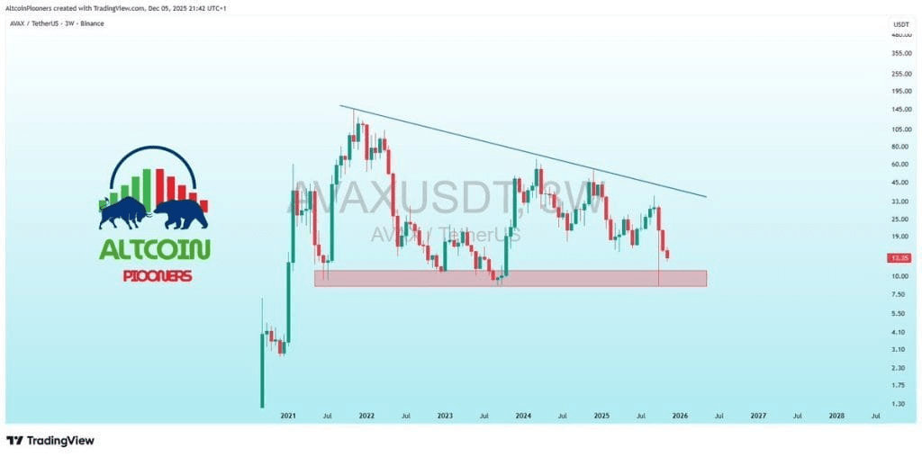 Avalanche looks strangely calm on higher time frames. The chart shared by Altcoin Pioneer reveals a clear downward structure extending from the peak of 2021 to today, with each lower peak respecting that sloping trendline. The overall movement forms a stable channel that has guided the price of AVAX for over 3 years.