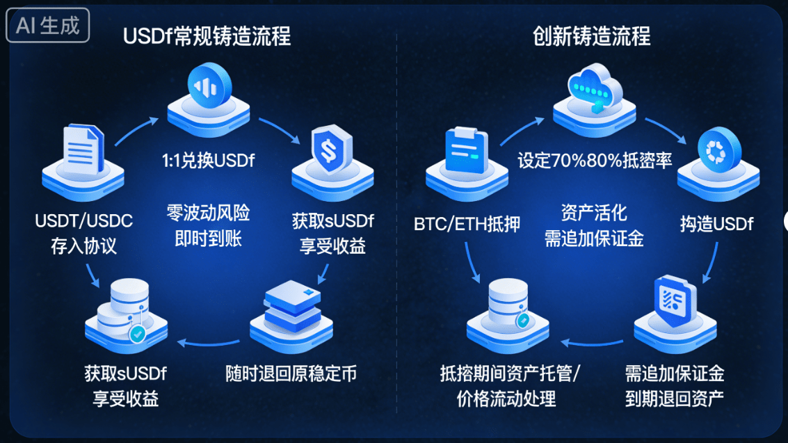 Compared to conventional minting, innovative minting is the core differentiated highlight of USDf, primarily targeting users holding non-stablecoin assets like BTC and ETH who are unwilling to liquidate. The core logic is: users collateralize BTC, ETH, and other assets, and lock them for a certain period to mint USDf, while still being able to enjoy potential appreciation of the collateral. However, due to the significant price volatility of non-stablecoin assets, this mode requires users to add a certain proportion of collateral to avoid liquidation risk.