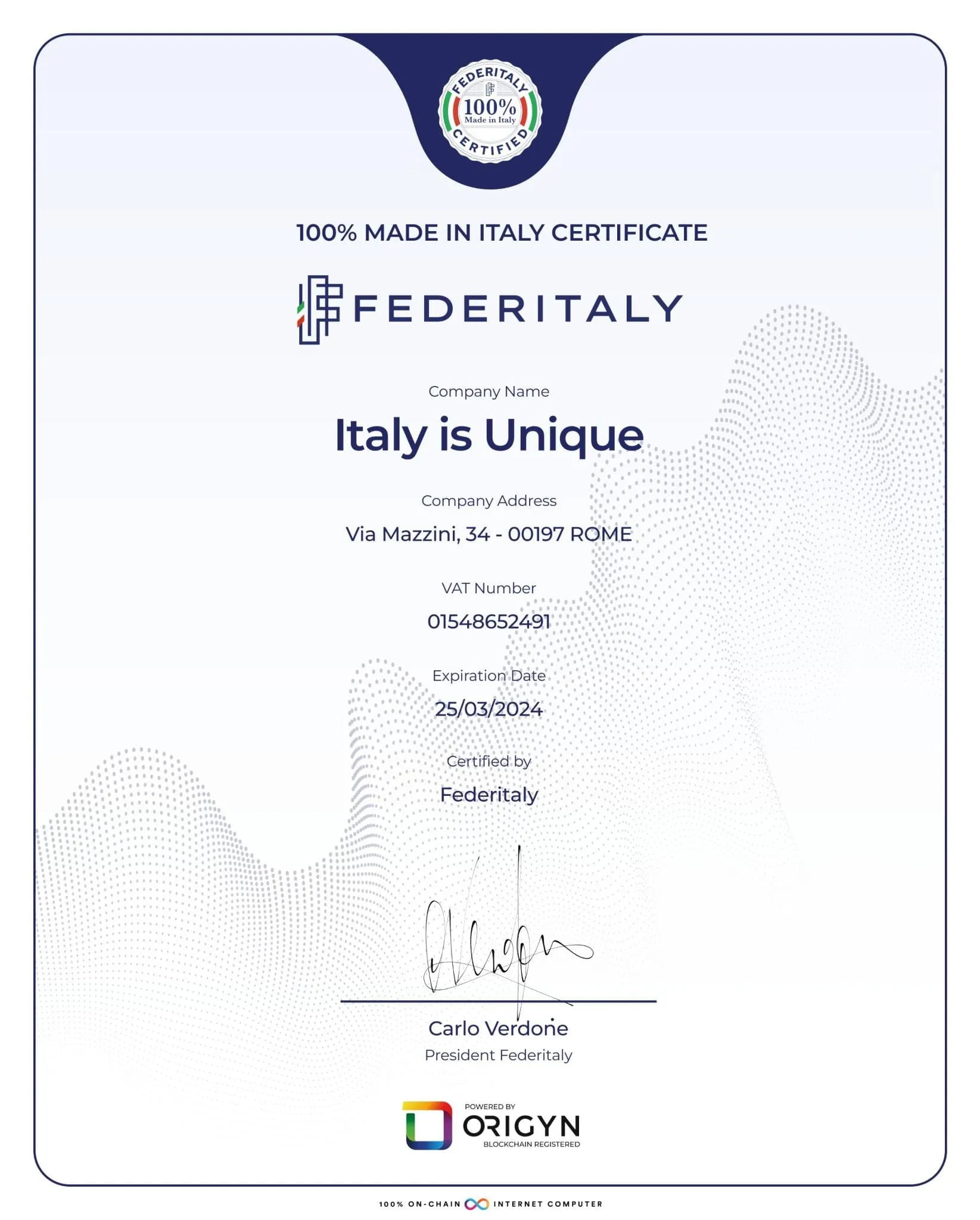 The “FederItaly 100% Made in Italy” seal is a trusted symbol of authenticity and quality, and companies must undergo rigorous verification to ensure that all materials and workmanship are sourced from Italy.