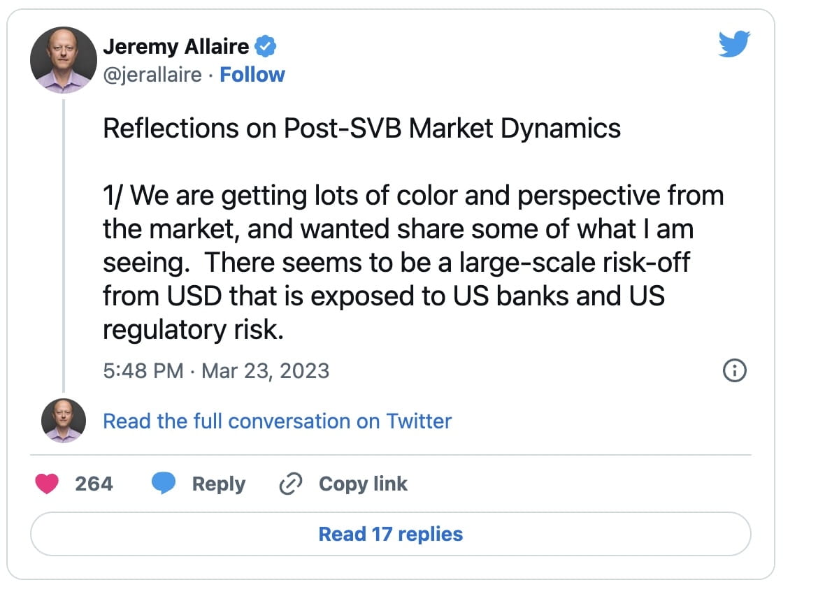 Circle CEO Jeremy Allaire has taken to Twitter to share his reflections on the market dynamics following the collapse of Silicon Valley Bank (SVB). In his tweet, he highlights the large-scale risk-off from USD that is exposed to US banks and US regulatory risk, which is leading to deep market anxiety.