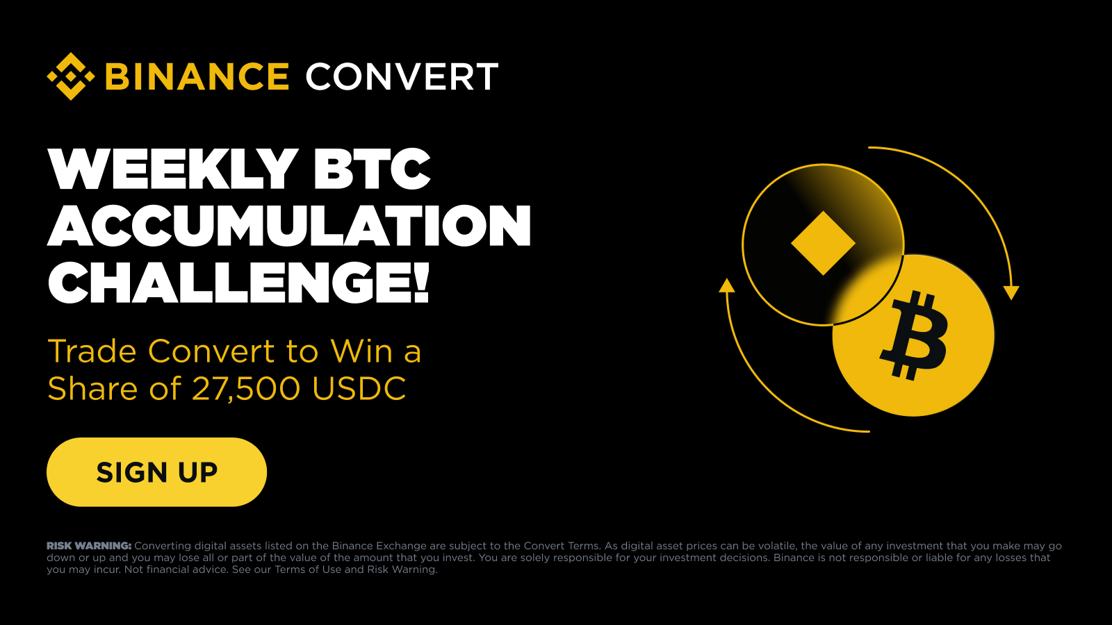 Each week, participants will be ranked based on the BTC accumulated through Binance Convert during that week. The top 500 eligible users each week will equally share a reward pool of 5,000 USDC in token vouchers, with a maximum of 10 USDC per user.