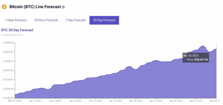 With this in mind, Finbold consulted with machine learning algorithms on crypto monitoring platform PricePredictions. Notably, AI technology predicts that BTC will trade above $30,000 by the end of next month. The prediction puts Bitcoin’s price at $30,697 on April 30, 2023, based on the latest information available on March 30.