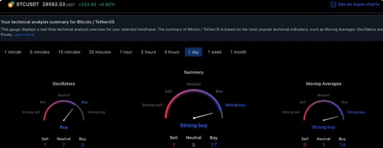 Meanwhile, financial and cryptocurrency tracking site TradingView’s 1-day indicator sentiment is bullish. The summary indicates a "Strong Buy" at 12, as summarized by the oscillator indicating a "Buy" at 3 and the moving averages in a "Strong Buy" range at 14.