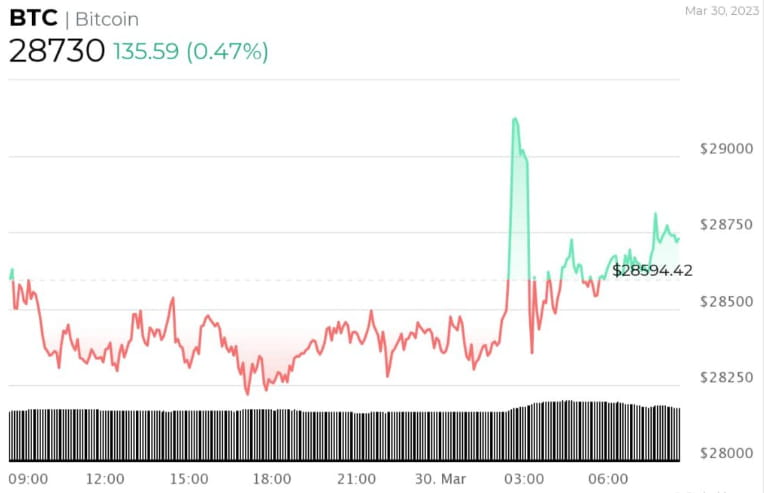 The price of Bitcoin ( BTC ) briefly climbed above $29,000 on March 30 as the flagship digital asset continued its push to reclaim the psychological $30,000 level.