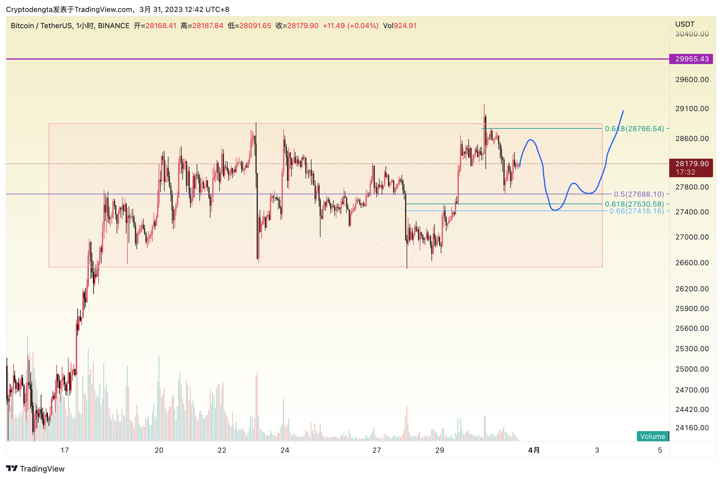 #BTC The long-term bullish trend is maintained, and the spot and low-level long orders continue to be held. In the short term, the high-level box is still maintained, and the range is 028800-26500. Continue to buy on dips or buy and hold. When approaching the important resistance range of the daily line, appropriately reduce the high leverage position to sell high and buy low