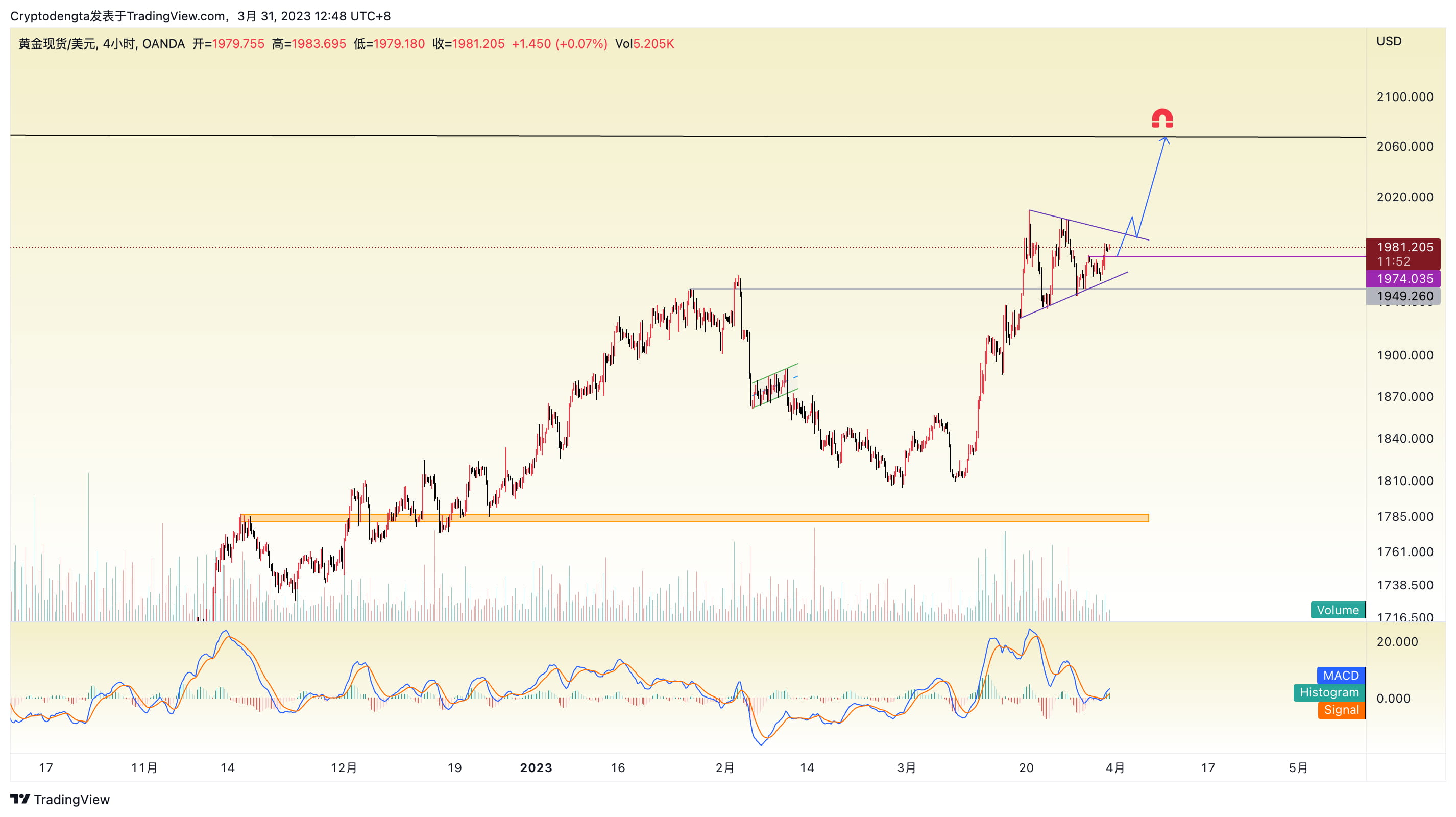 3. Gold #XAUUSD Daily line breaks through the previous high and consolidates, 4 hours builds an ascending wedge, breaks through the wedge upward to see last year's high near 2060, refer to the 1970-1974 range to buy during the day, bullish 1990-1994