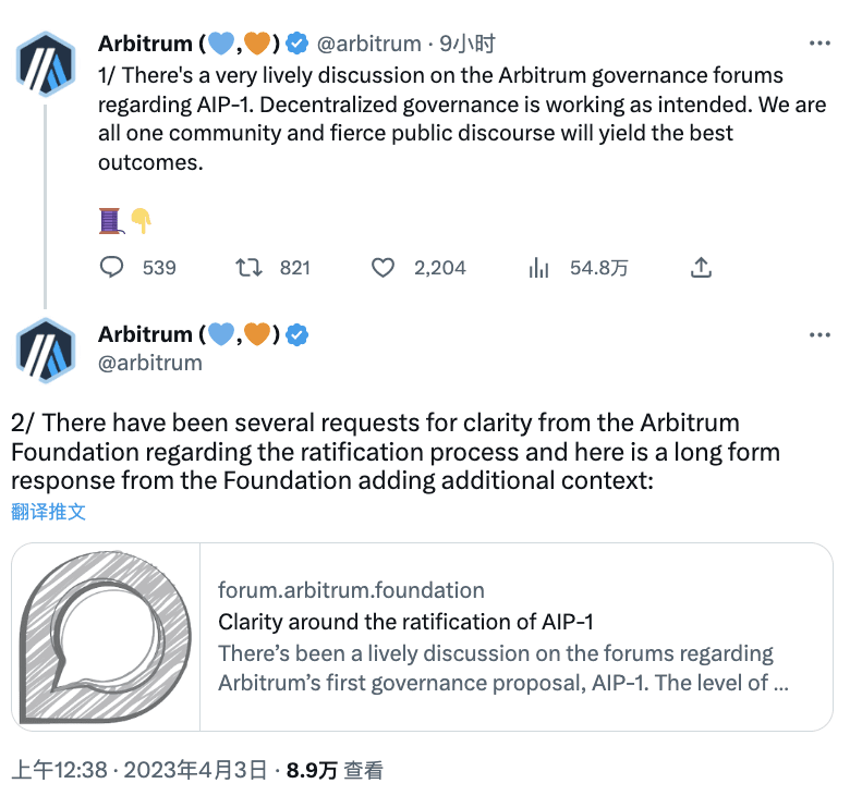 Arbitrum has responded to the governance dispute on its official Twitter account and forwarded a long clarification posted on the official governance forum. Regarding some of the controversies involved in the governance proposal, Arbitrum explained that with the launch of the DAO, a "chicken or egg" problem arose, and many decisions had to be made before the official launch. Regarding AIP-1, Arbitrum pointed out that the goal of the proposal is to involve the community in initial decision-making and ultimately allow token holders to approve initial decisions and frameworks through DAO voting. Regarding the on-chain transfer of 50 million ARB, Arbitrum clarified that the foundation did not sell 50 million ARB tokens. 40 million of them were used as a savvy participant in the loan allocation financial market, and the remaining 10 million were converted into fiat currency and used for operating costs.