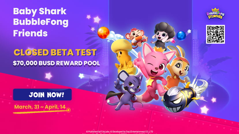 The world's first interactive and collaborative blockchain game, Baby Shark BubbleFong Buddies, starring the well adored Pinkfong and Baby Shark characters, has announced its Closed Beta Test. Baby Shark BubbleFong Buddies has a sizable reward pool $70,000 USDT set aside for the Daily Ranking Event, which encourages players to take part and work to improve their skills.
