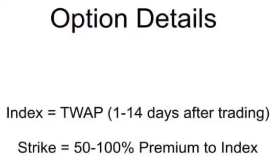 In this case, the project party will choose to set the exercise price of the call option at a premium of 50% – 100% of the index price. Since the index price can usually be determined on-chain or in other markets, the exercise price does not need to be known when the transaction is completed.