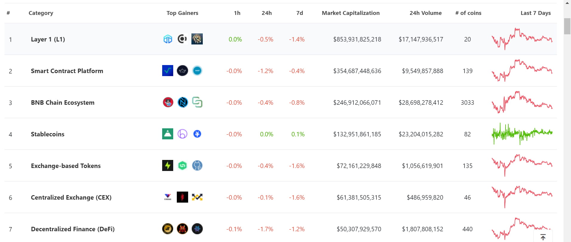 · https://www.coingecko.com/en/categories Offers an overview of coins and tokens for specific use cases, industries, layer 1 blockchains, etc.