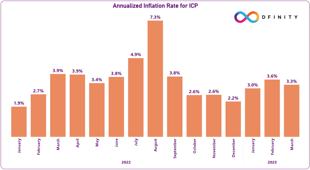 ICP token inflation is caused by the minting of ICP to reward node providers and NNS governance participants. From January 2023 to March 2023, the annualized inflation rate of ICP was 3.3%, which is much lower than the governance reward The target inflation rate is 8% annually.