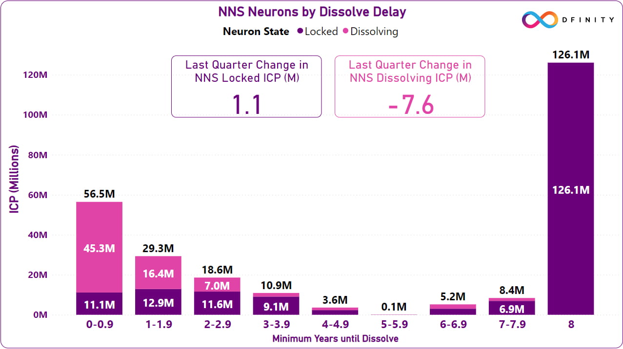 The chart above shows the status of NNS on April 1, 2023, reflecting the number of ICP tokens locked and dissolved by the length of the dissolve delay, with 12,610,000 ICP (25.3% of the total supply) locked for at least 8 years.