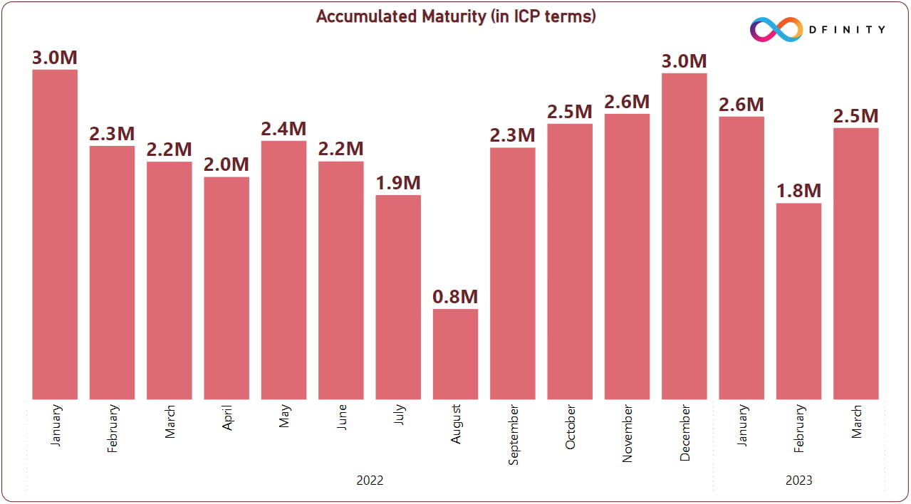 Accumulated maturity can therefore be thought of as delayed inflation, and so far Neuron holders have largely decided to leave their rewards until expiry, with a total maturity of 58.2 million ICP accumulated since creation, Below are the accumulations to maturity over the last twelve months.