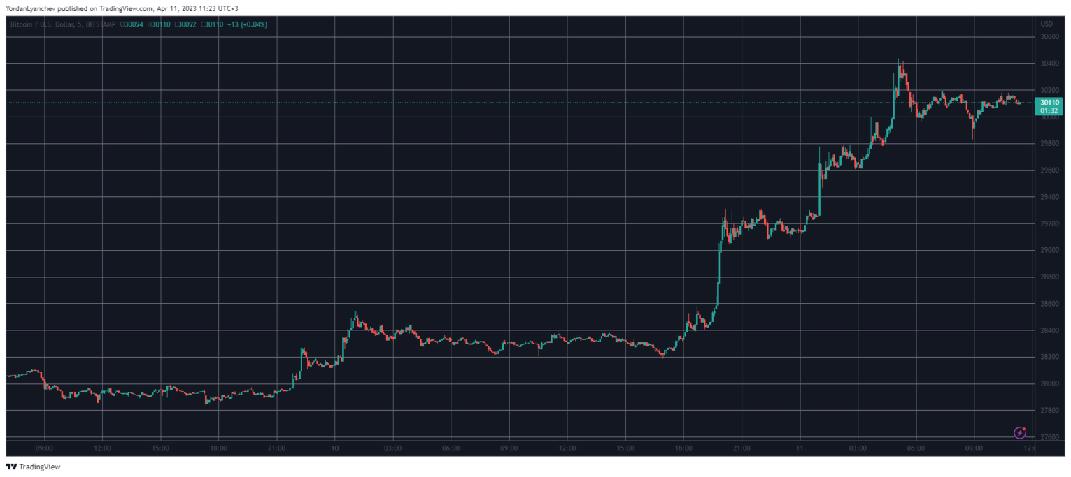 However, bitcoin didn’t wait until Wednesday. It went on the offensive late Monday and early Tuesday morning. It first broke above $29,000, but unlike the previous attempts, this time, it kept going. This resulted in another massive price surge to just over $30,400, which became its highest price tag since before the Terra collapse.