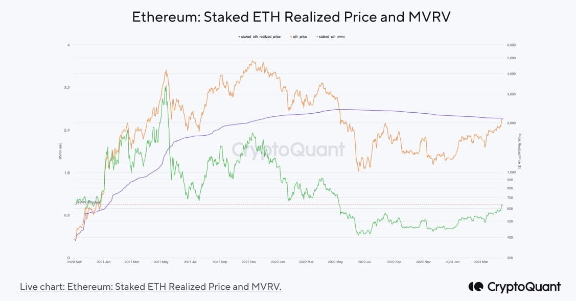 The average staked ETH is at the break-even point, with the Market Value to Realized Value (MVRV) ratio hovering around 1. This means that investors who staked their ETH are currently neither making a profit nor a loss, which may indicate a stable market for Ethereum.
