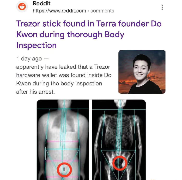C3 reported that today the community spread the news that "Do Kwon, the founder of Terra, found a Trezor hardware wallet in his body after his arrest."