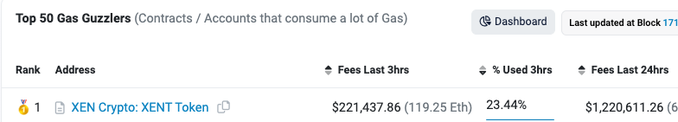 Curious why your ETH txns have been so expensive in the last 24 hrs? This XEN token has been consuming up to 90% of gas per block in single txns.