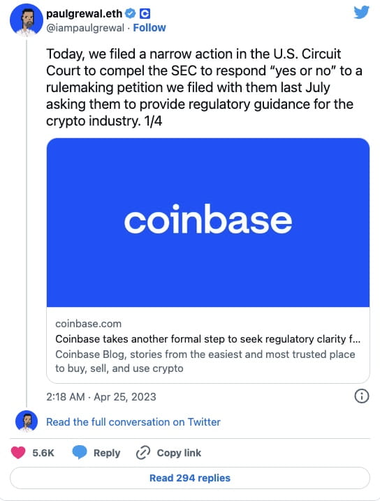 Accompanying the action was a blog post penned by Coinbase Chief Legal Officer Paul Grewal, who said the Administrative Procedure Act requires the SEC to respond to the exchange’s rulemaking petition “within a reasonable time.”