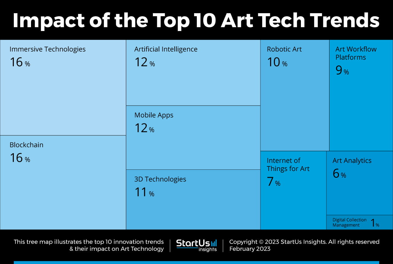 In the Innovation Map below, you can get an overview of the top 10 art technology trends and innovations impacting 1,253 companies around the world. Additionally, the Art Tech Innovation Map reveals 20 handpicked startups working on emerging technologies that are advancing their respective fields.
