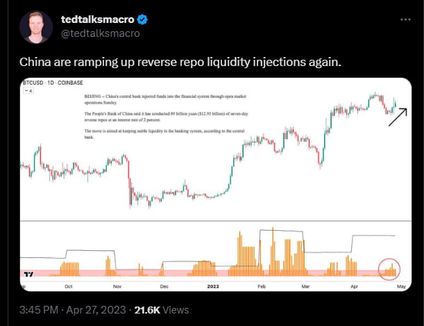 Macro analyst Ted (@tedtalksmacro) argues that global liquidity is a key driver of Bitcoin's price, with recent BTC price rallies correlating with an increase in global liquidity. For example, the US Federal Reserve's expansion of its balance sheet through the Bank Term Funding Program (BTFP) during the banking crisis boosted Bitcoin's price.