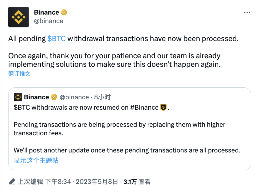 Binance tweeted that all pending BTC withdrawals have now been processed. Its team is already implementing a solution to ensure this does not happen again.