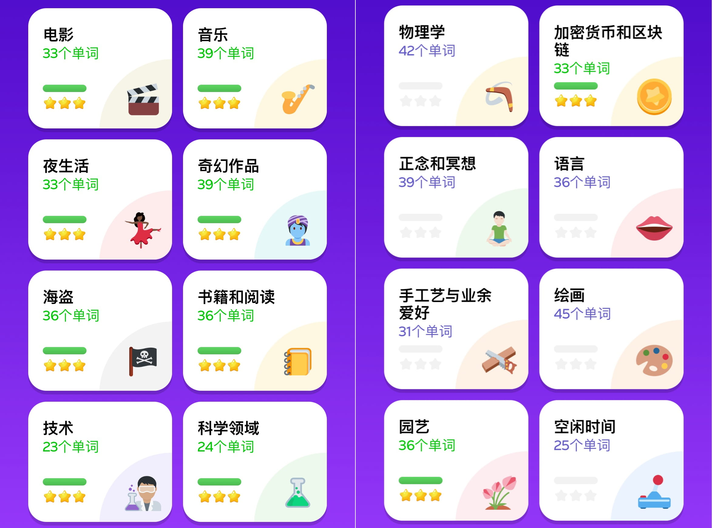 The vocabulary database is continuously updated, covering travel, transportation, work, business English, etc.; including vocabulary sets such as economics, science, drama, cryptocurrency and blockchain;