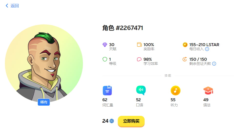 Rare attribute talent 30, daily income 155-210 LSTAR, about 0.22 US dollars, the profit is 33 US dollars, the cost is 24 US dollars, and you can earn 9 US dollars after learning English, which can be regarded as a reward for completing the learning task.